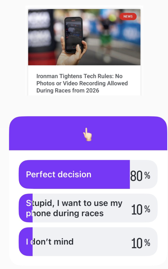 The results are clear: a whopping 80% of respondents agree that it’s a smart decision for Ironman to prohibit athletes from filming or photographing during the race. Only 10% disagreed, wishing they could still capture footage with their devices, while another 10% said it simply doesn’t matter to them.